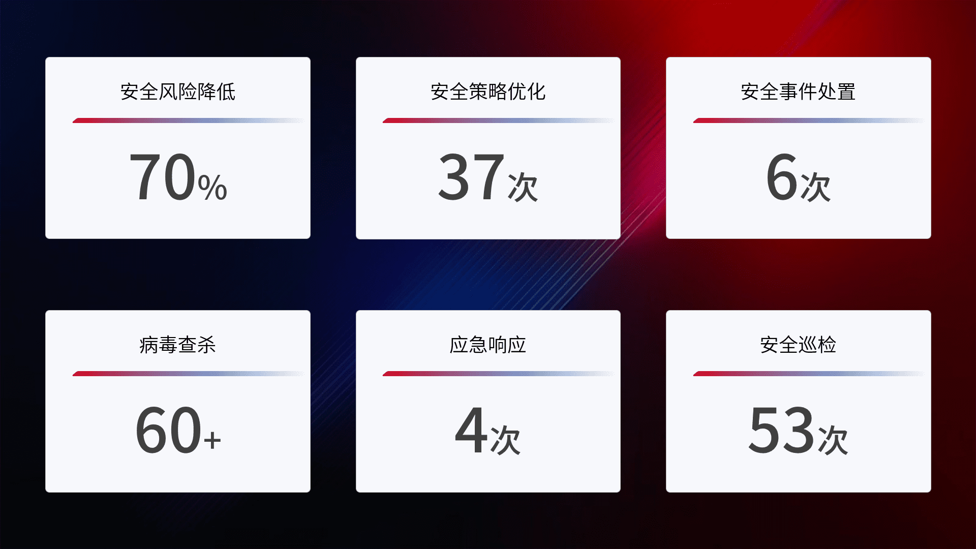 提供全面的安全事件报告体系,,包括处置报告、、周报、、、、季度和年度总结,,,,结合持续监控,,,帮助客户深入了解网络安全状况。。